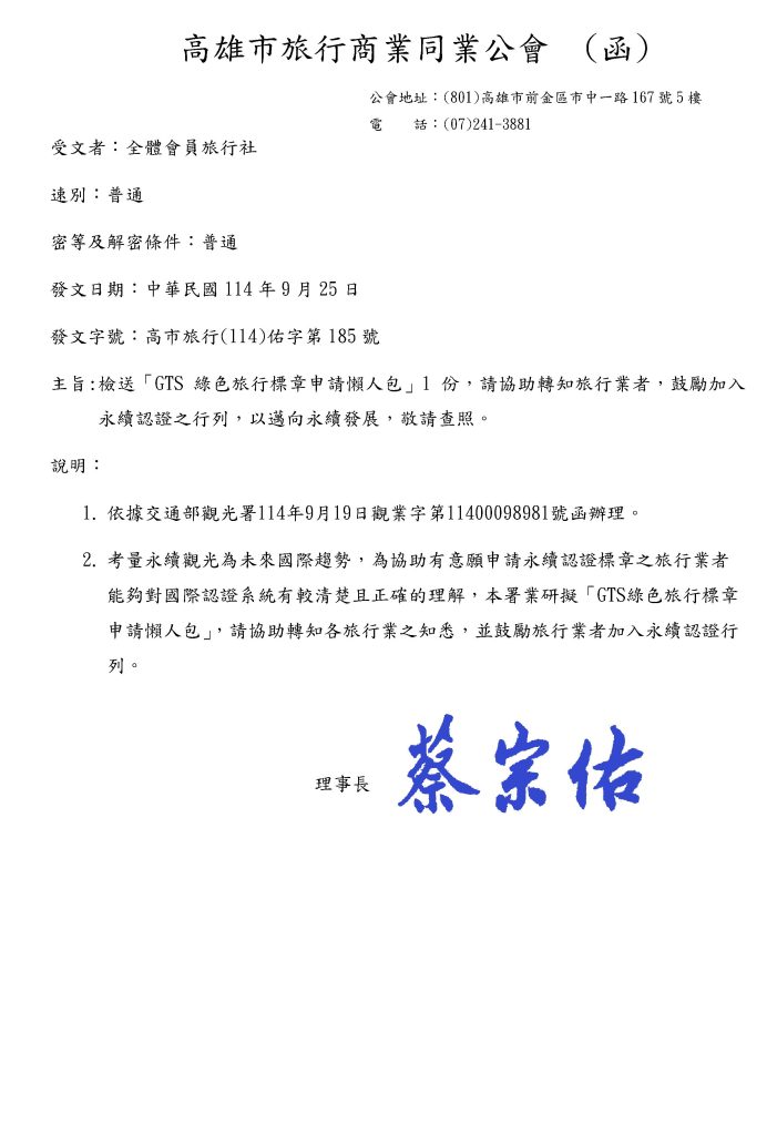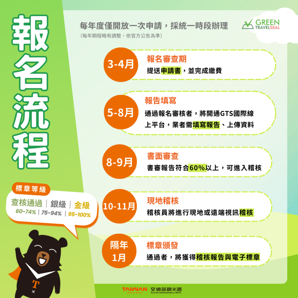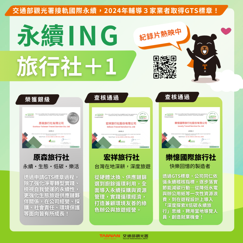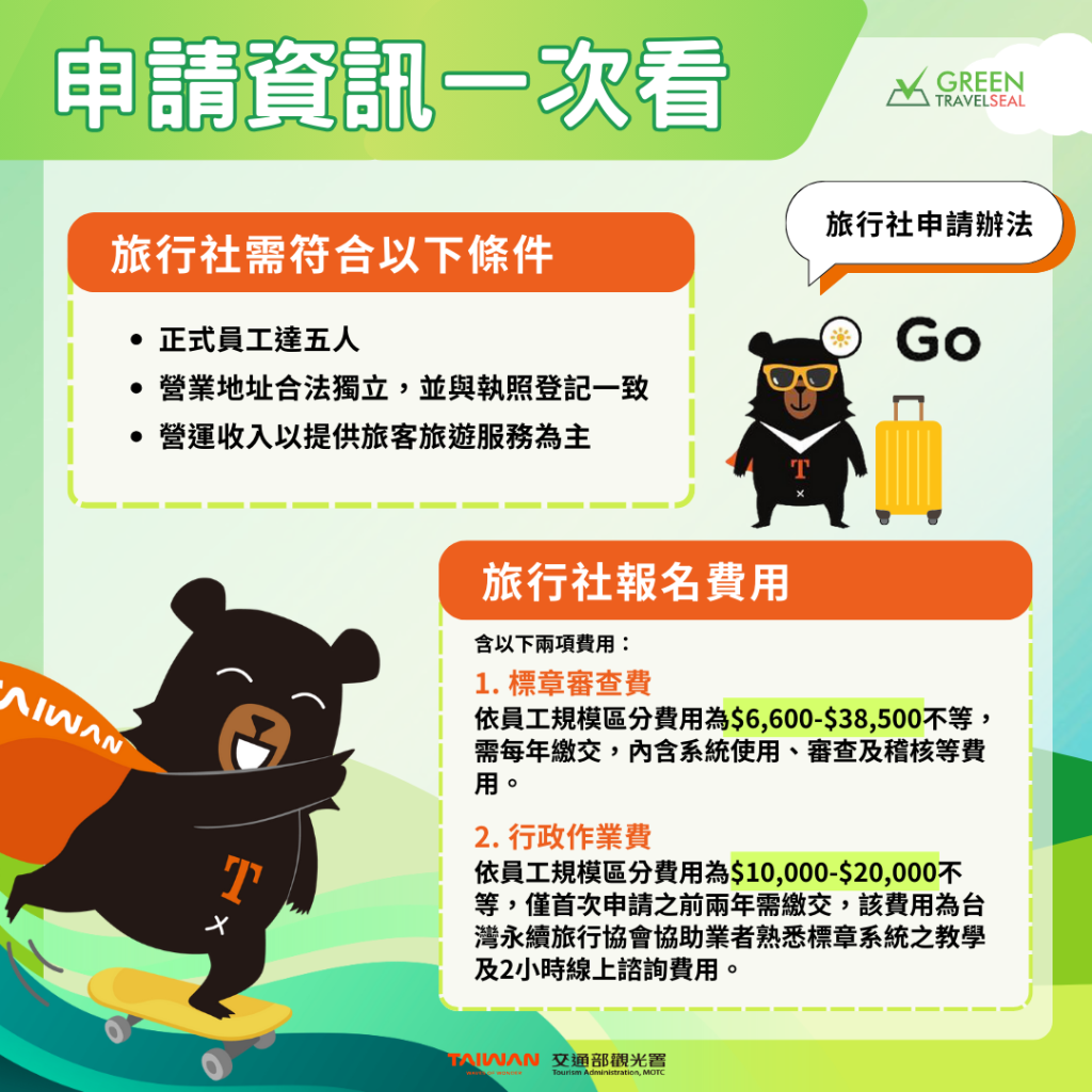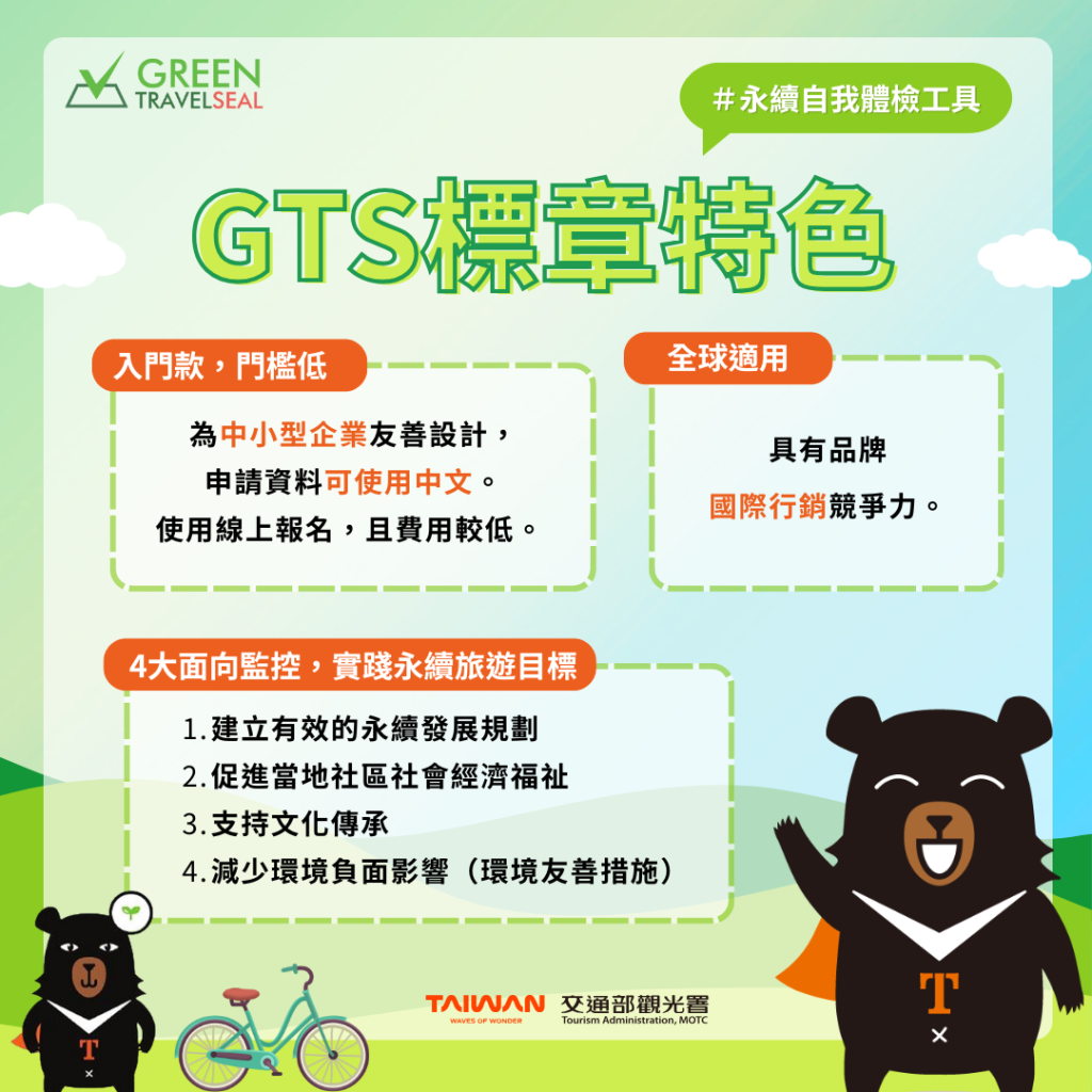 檢送「GTS綠色旅行標章申請懶人包」1份,請協助轉知旅行業者,鼓勵加入永續認證之行列,以邁向永續發展,敬請查照。