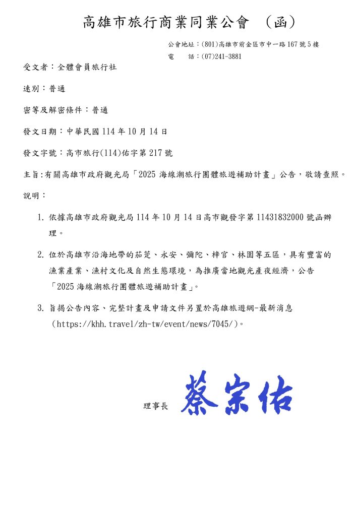 有關高雄市政府觀光局「2025海線潮旅行團體旅遊補助計畫」公告,敬請查照。