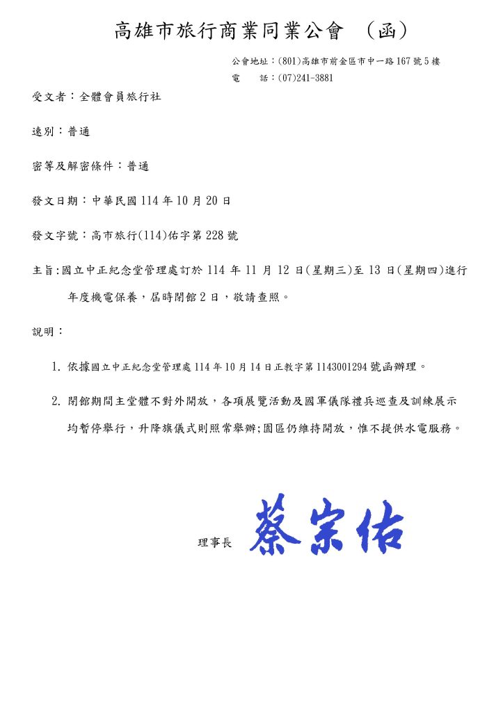 國立中正紀念堂管理處訂於114年11月12日(星期三)至13日(星期四)進行年度機電保養,屆時閉館2日,敬請查照。
