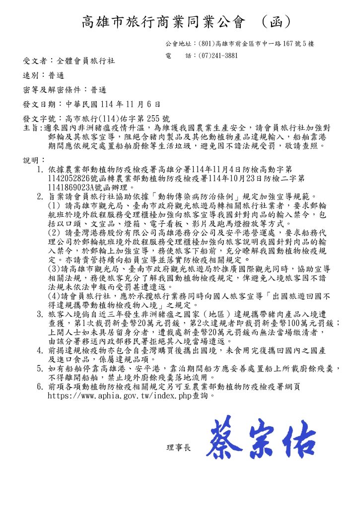 邇來國內非洲豬瘟疫情升溫,為維護我國農業生產安全,請會員旅行社加強對郵輪及其旅客宣導,阻絕含豬肉製品及其他動植物產品違規輸入,船舶靠港期間應依規定處置船舶廚餘等生活垃圾,避免因不諳法規受罰,敬請查照。