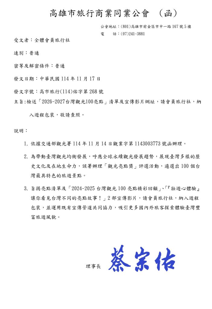 檢送「2026-2027台灣觀光100亮點」清單及宣傳影片網址,請會員旅行社,納入遊程包裝,敬請查照。