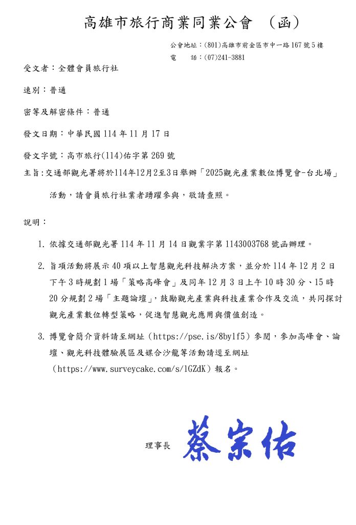 交通部觀光署訂於本(114)年12月2日至3日舉辦之「2025觀光產業數位博覽會-台北場」,檢送活動資訊,請會員旅行社,惠請週知,敬請查照。