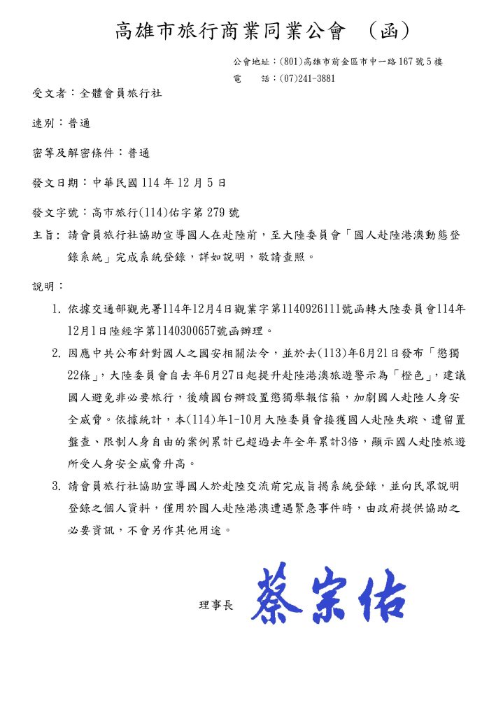 請會員旅行社協助宣導國人在赴陸前,至大陸委員會「國人赴陸港澳動態登錄系統」完成系統登錄,詳如說明,敬請查照。