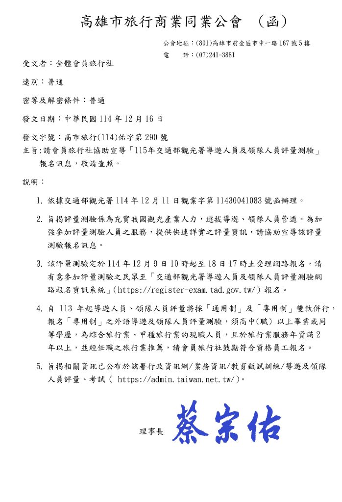 請會員旅行社協助宣導「115年交通部觀光署導遊人員及領隊人員評量測驗」報名訊息,敬請查照。