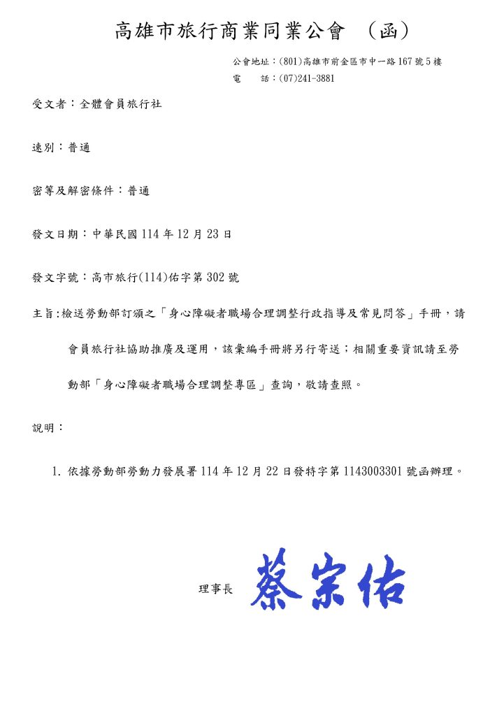 會員旅行社協助推廣及運用,該彙編手冊將另行寄送;相關重要資訊請至勞動部「身心障礙者職場合理調整專區」查詢,敬請查照。