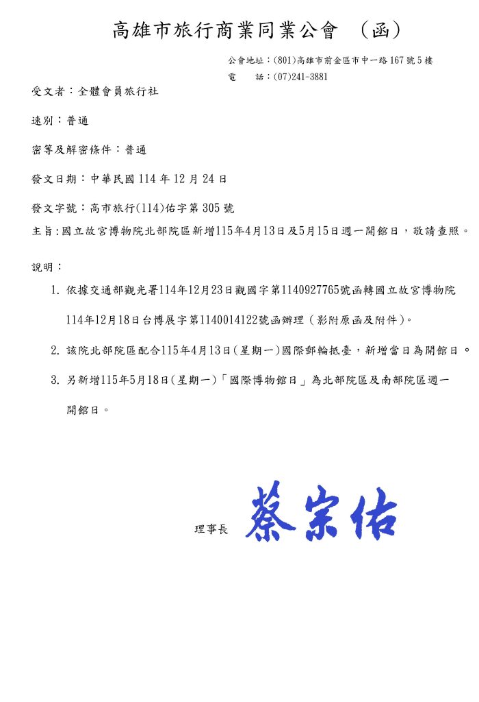 國立故宮博物院北部院區新增115年4月13日及5月15日週一開館日,敬請查照。