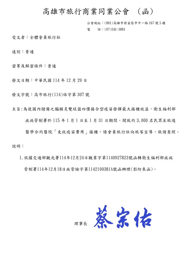 為使國內儲備之腦膜炎雙球菌四價接合型疫苗發揮最大接種效益,衛生福利部疾病管制署於115年1月1日至1月31日期間,開放約3,000名民眾至旅遊醫學合約醫院「免收疫苗費用」接種,請會員旅行社向旅客宣導,敬請查照。