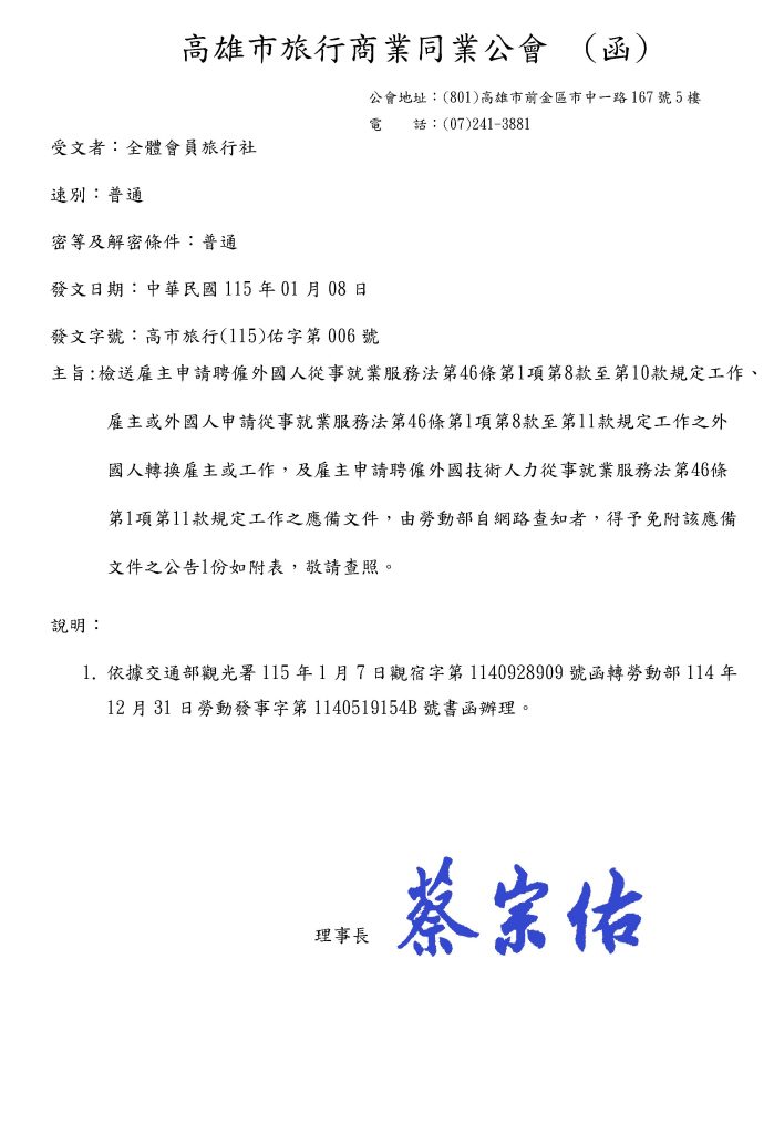 檢送雇主申請聘僱外國人從事就業服務法第46條第1項第8款至第10款規定工作、雇主或外國人申請從事就業服務法第46條第1項第8款至第11款規定工作之外國人轉換雇主或工作,及雇主申請聘僱外國技術人力從事就業服務法第46條第1項第11款規定工作之應備文件,由勞動部自網路查知者,得予免附該應備文件之公告1份如附表,敬請查照。