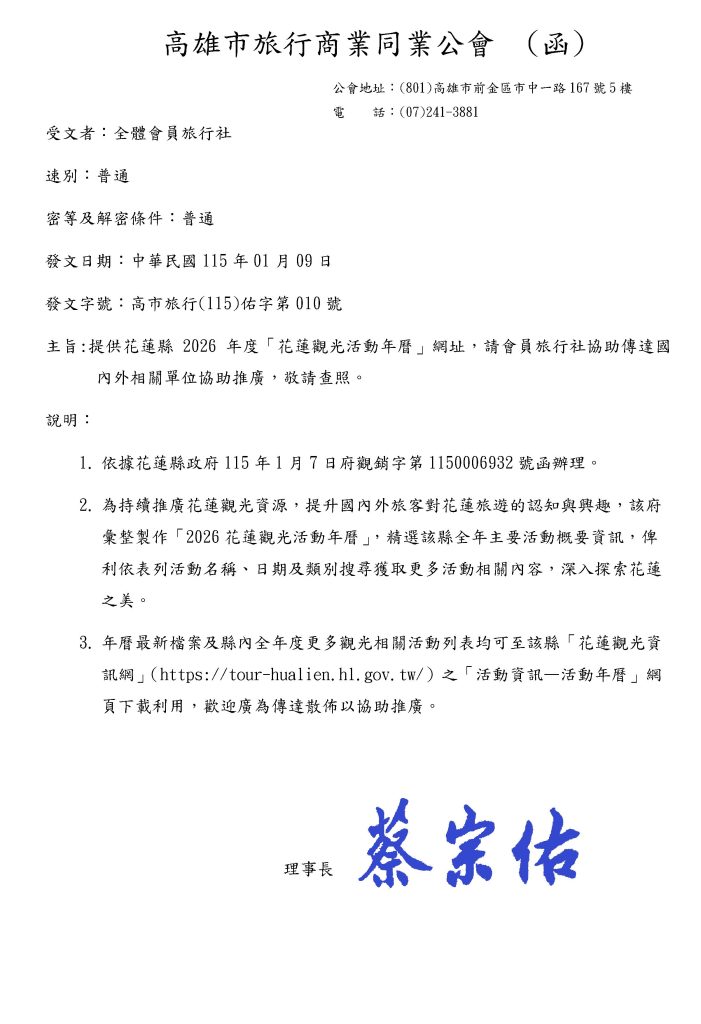 提供花蓮縣2026年度「花蓮觀光活動年曆」網址,請會員旅行社協助傳達國內外相關單位協助推廣,敬請查照。
