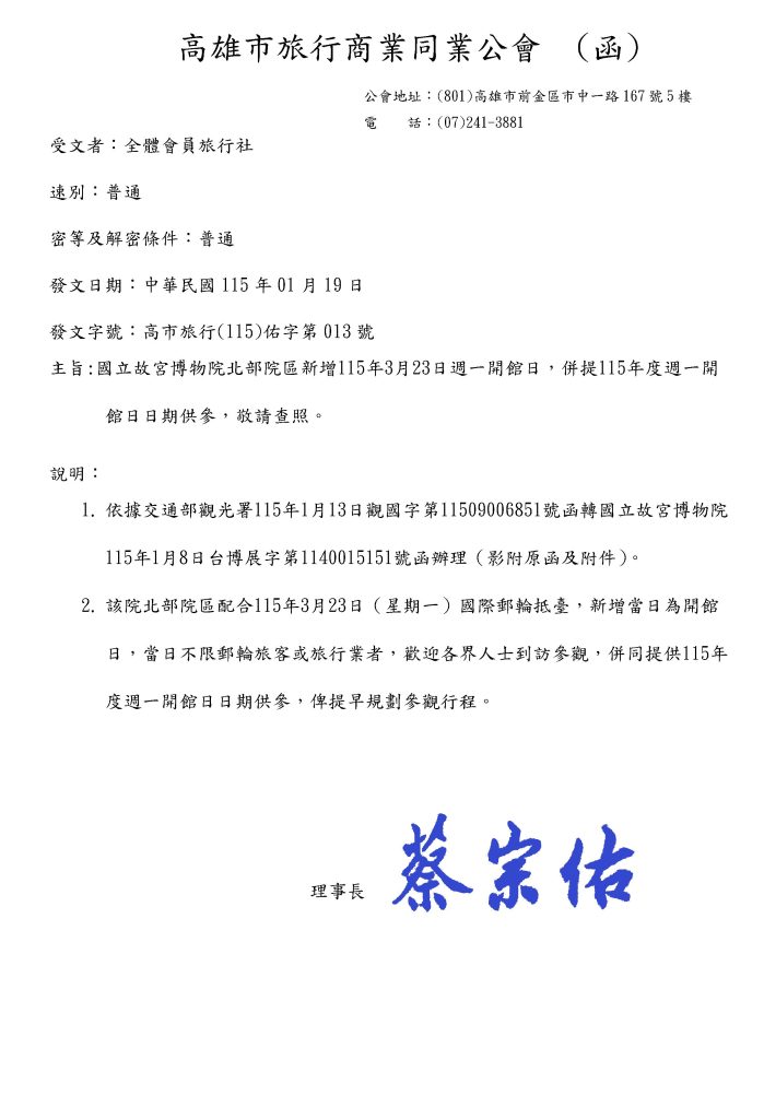 國立故宮博物院北部院區新增115年3月23日週一開館日,併提115年度週一開館日日期供參,敬請查照。