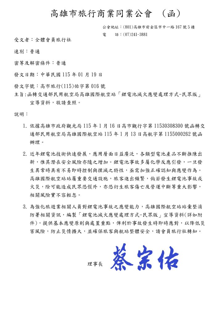 函轉交通部民用航空局高雄國際航空站「鋰電池滅火應變處理方式-民眾版」宣導資料,敬請查照。