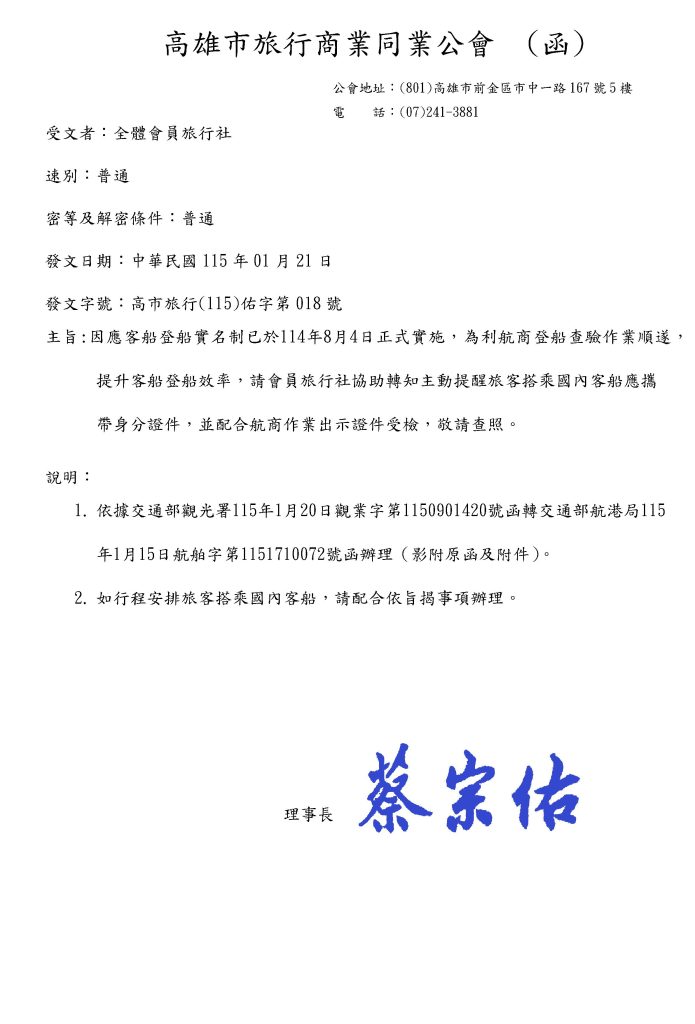 因應客船登船實名制已於114年8月4日正式實施,為利航商登船查驗作業順遂,提升客船登船效率,請會員旅行社協助轉知主動提醒旅客搭乘國內客船應攜帶身分證件,並配合航商作業出示證件受檢,敬請查照。