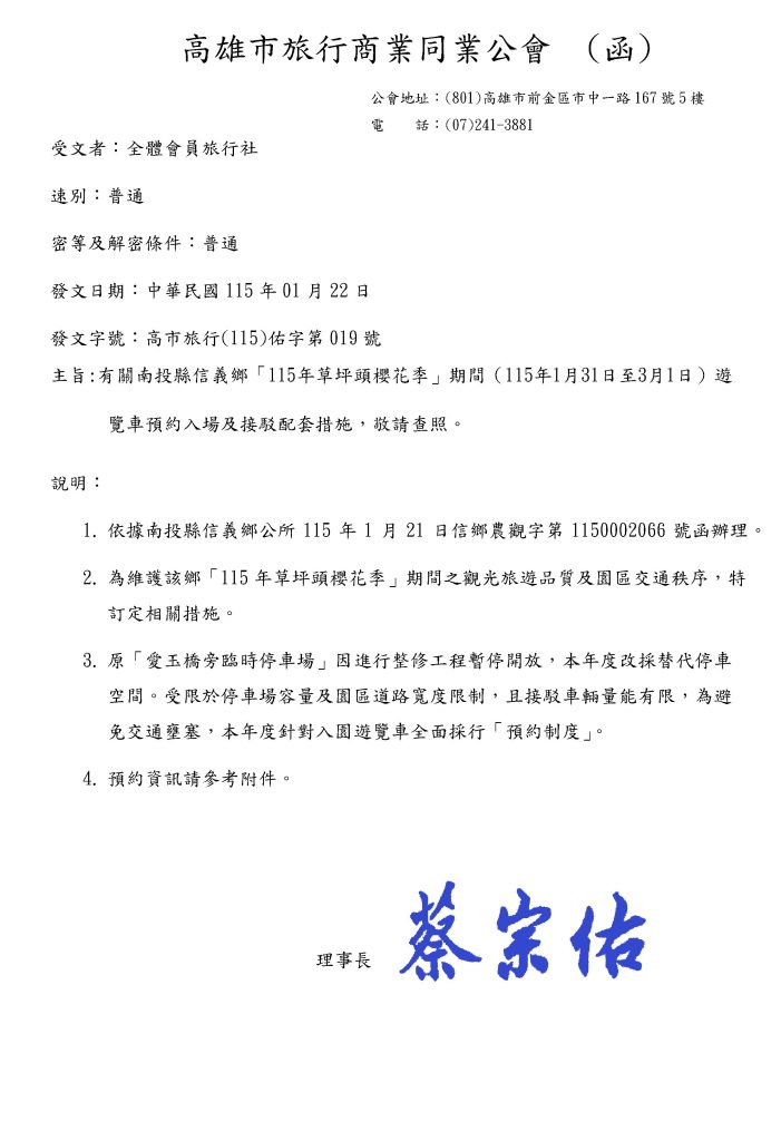 有關南投縣信義鄉「115年草坪頭櫻花季」期間(115年1月31日至3月1日)遊覽車預約入場及接駁配套措施,敬請查照。