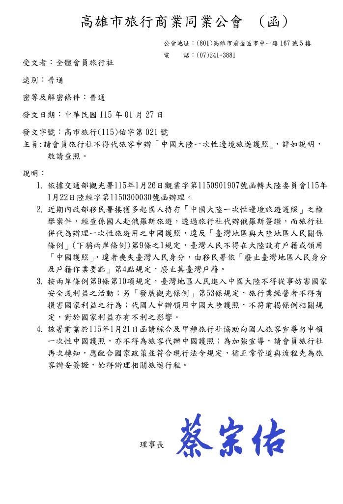 請會員旅行社不得代旅客申辦「中國大陸一次性邊境旅遊護照」,詳如說明,敬請查照。