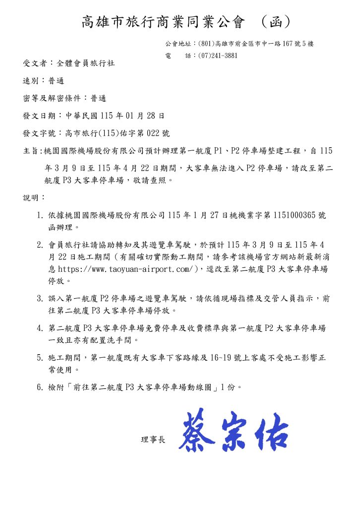 年3月9日至115年4月22日期間,大客車無法進入P2停車場,請改至第二航廈P3大客車停車場,敬請查照。