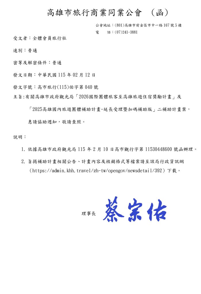 有關高雄市政府觀光局「2026國際團體旅客至高雄旅遊住宿獎勵計畫」及「2025高雄國內旅遊團體補助計畫-延長受理暨加碼補助版」二補助計畫案,惠請協助週知,敬請查照。