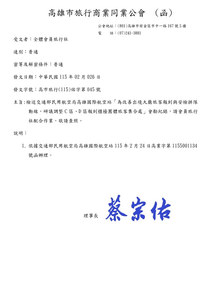 檢送交通部民用航空局高雄國際航空站「為改善出境大廳旅客報到與安檢排隊動線,研議調整C區、D區報到櫃檯團體旅客集合處」會勘紀錄,請會員旅行社配合作業,敬請查照。