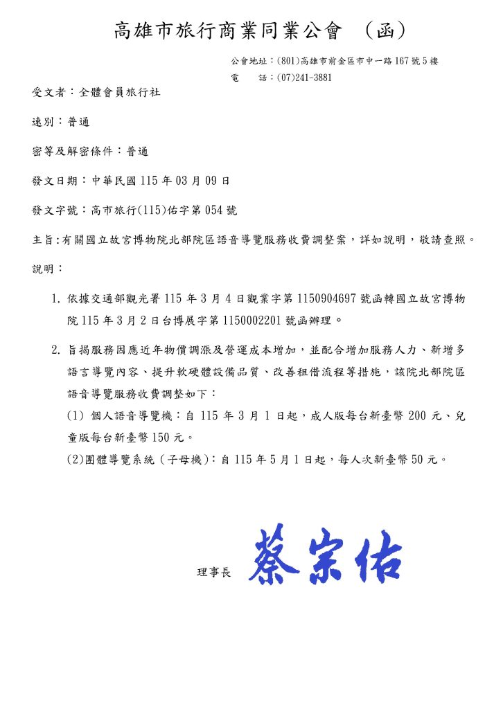 有關國立故宮博物院北部院區語音導覽服務收費調整案,詳如說明,敬請查照。