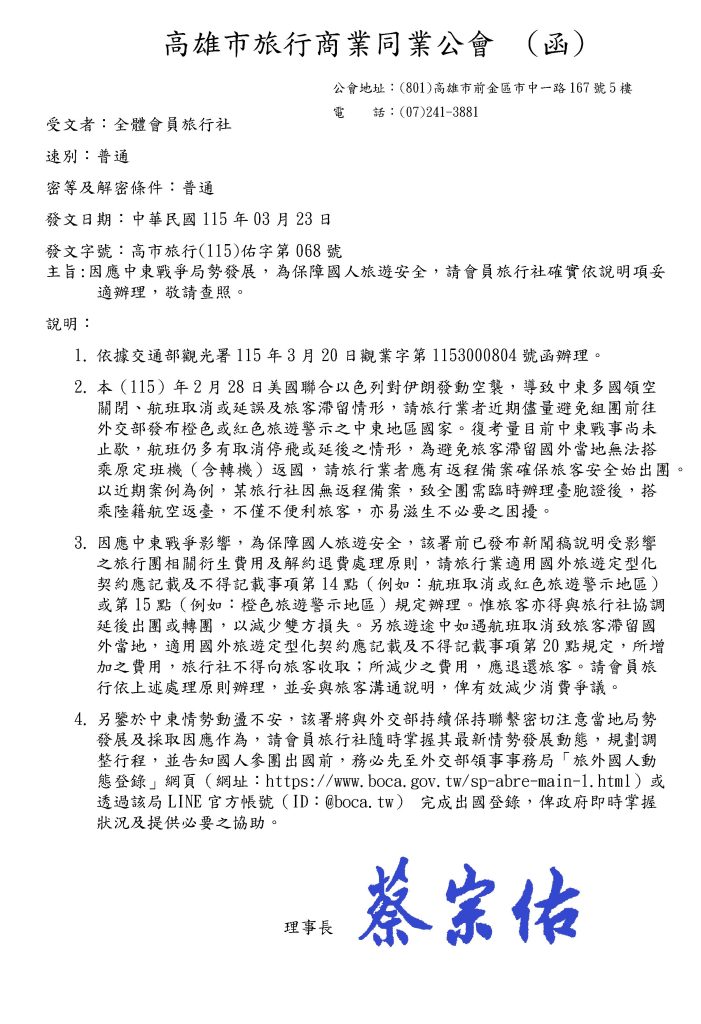 因應中東戰爭局勢發展,為保障國人旅遊安全,請會員旅行社確實依說明項妥適辦理,敬請查照。