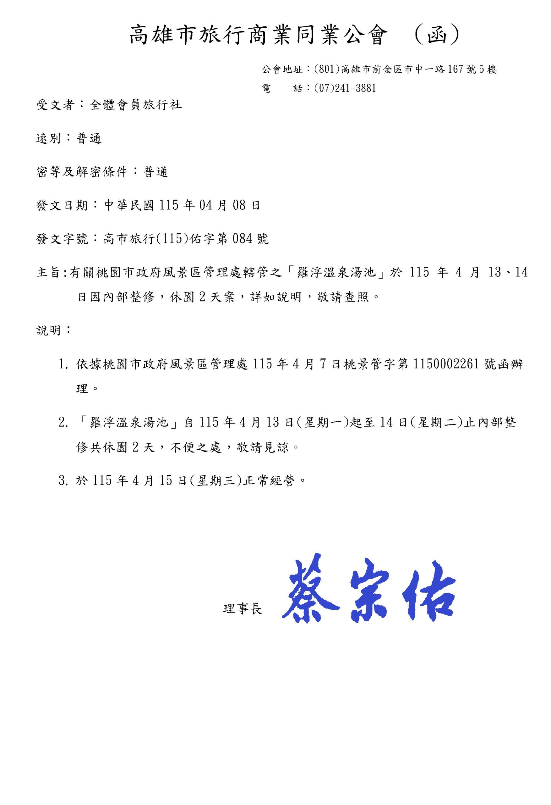 有關桃園市政府風景區管理處轄管之「羅浮溫泉湯池」於115年4月13、14日因內部整修,休園2天案,詳如說明,敬請查照。